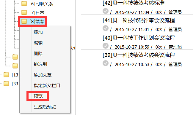 第二:需預(yù)覽文章對應(yīng)欄目,操作步驟選中新添加文章對應(yīng)的欄目后右鍵選擇“預(yù)覽”,文章所屬欄目預(yù)覽成功。如下圖中,新文章屬“績考”欄目,則選中績考右鍵選擇“預(yù)覽”。