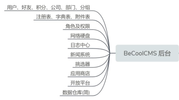 講解從BeCool CMS框架體系展開,BeCool CMS的框架體從兩個維度進行,如下兩圖: